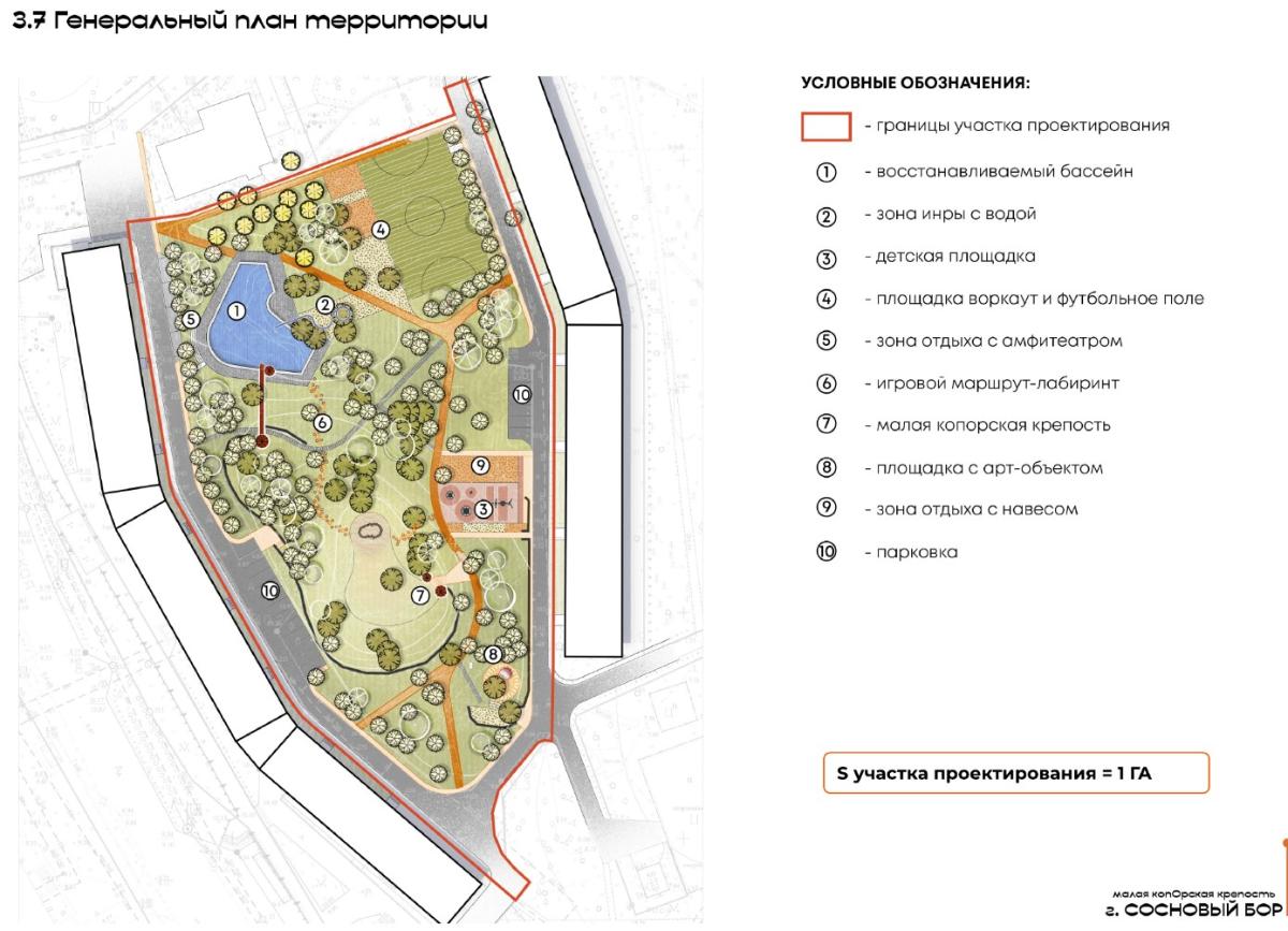 В проекте студенты предусмотрели восстановление бассейна с амфитеатром, несколько игровых зон, включая водные игры, тропу-лабиринт, затененные зоны отдыха, парковки, спортивные площадки для воркаута и игры в футбол. Сохраняются и существующие конструкции Малой Копорской крепости: башни и каменные укрепления.