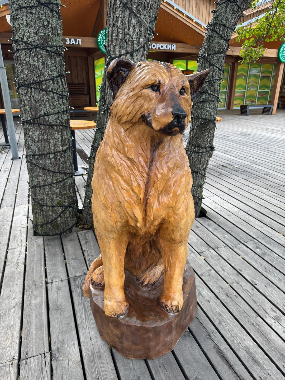 Мастера из города Луги Юрий (на фото справа) и Надежда Игнатьевы, ранее создавшие для парка скульптуру «Шишка», успешно справились с работой. 300-килограммовая деревянная фигура заняла свое место в зоне отдыха у стритфуда «Мой Сосновый Бор» в Приморском парке. Скульптура сразу же стала популярной: едва дождавшись установки, посетители парка с восторгом фотографировались с Кефиром и делились теплыми отзывами.